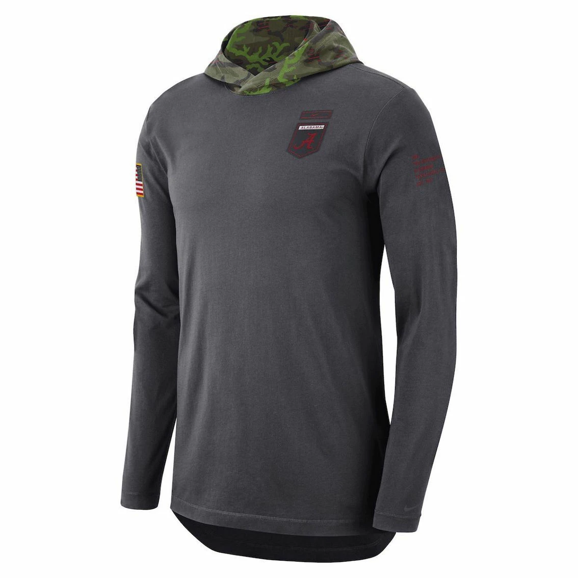 - Show your support for the Alabama Crimson Tide by sporting this Nike Military Long Sleeve Hoodie T-Shirt. This tee features lightweight material ensuring you stay comfortable, while the hood keeps your head and neck area warm in cooler temperatures. Complete with crisp Alabama Crimson Tide, everyone will know where your allegiance lies whenever you’re rocking this sweet gear.