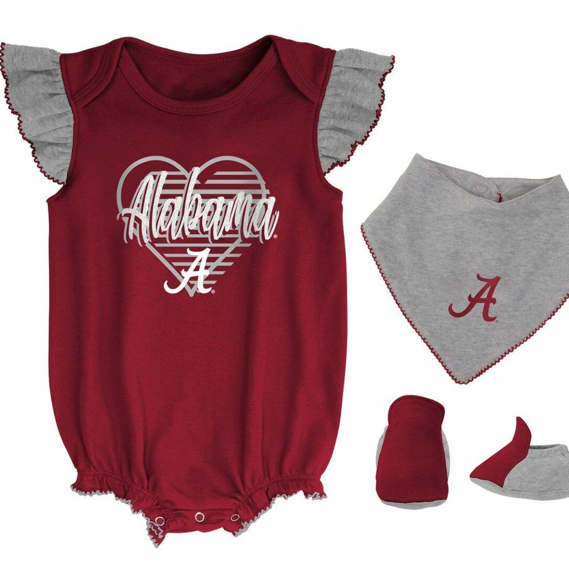 - Show everyone that the Alabama Crimson Tide have all of your little one’s love with this three-piece set. It features adorable Alabama Crimson Tide graphics on the bodysuit, bib and coordinating booties to elevate their blossoming fandom further. Plus, the ultra-soft fabric and snap closures ensure easy changing and total comfort.